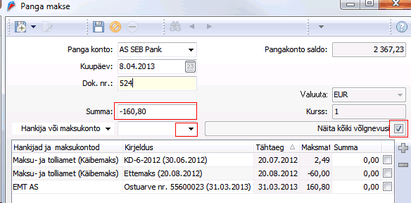 Maksude tasumine sisestage sarnaselt hankija arvete tasumisega panga makse ülemises osas