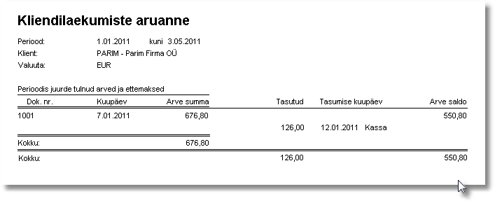 Kliendilaekumiste aruanne annab etteantud kuupäevade või kiirvalikust valitud perioodide vahemikus ülevaate konkreetse kliendi arvetest ja nende laekumistest.