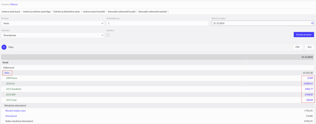 Kõik aruandes olevad sinist värvi nimetused ja numbrid on lahti klikitavad, mis võimaldab täpsemalt uurida, millest see bilansirida või bilansireal olev number koosneb.