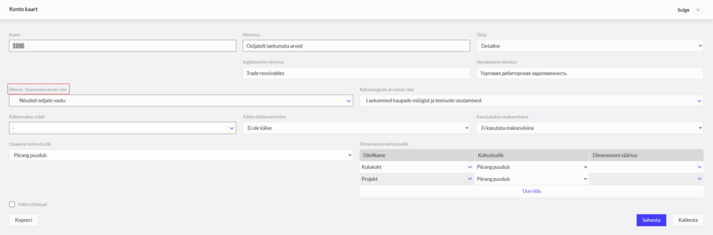 Kontokaardil on määratud, millisel bilansi või kasumiaruande real selle konto saldot näidatakse.