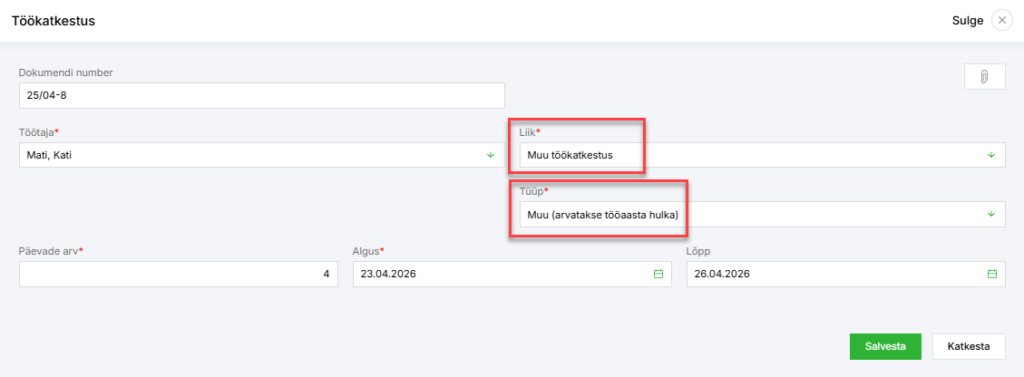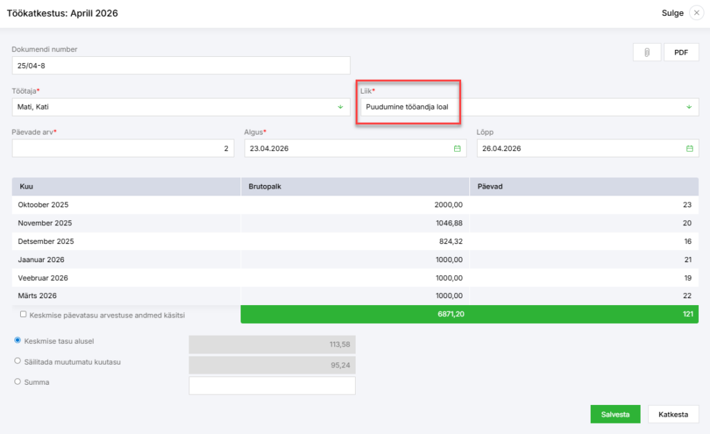 - Kui puudumise eest arvestatakse töötajale keskmist töötasu, kasutage töökatkestust liigiga „Puudumine tööandja loal“.